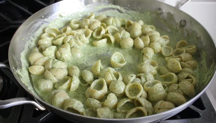 - Use any pasta shape you like, but orechiette works well because of its cup shape which holds the sauce.