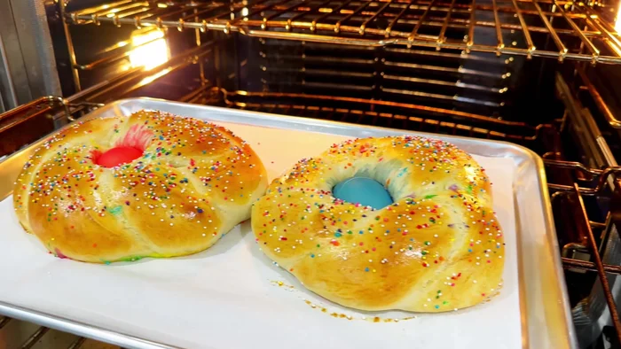 - Place two braided rings on a parchment-lined baking sheet. Loosely cover with plastic wrap and let rise in a warm place until doubled in size.