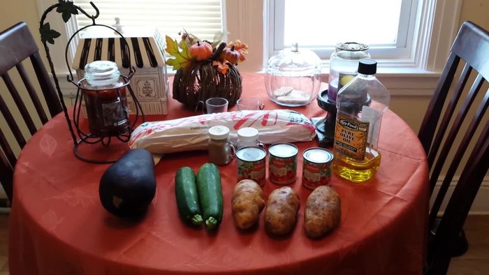 - Chop the vegetables (eggplant, squash, and potatoes into cubes). Peel and wash the potatoes before cutting.